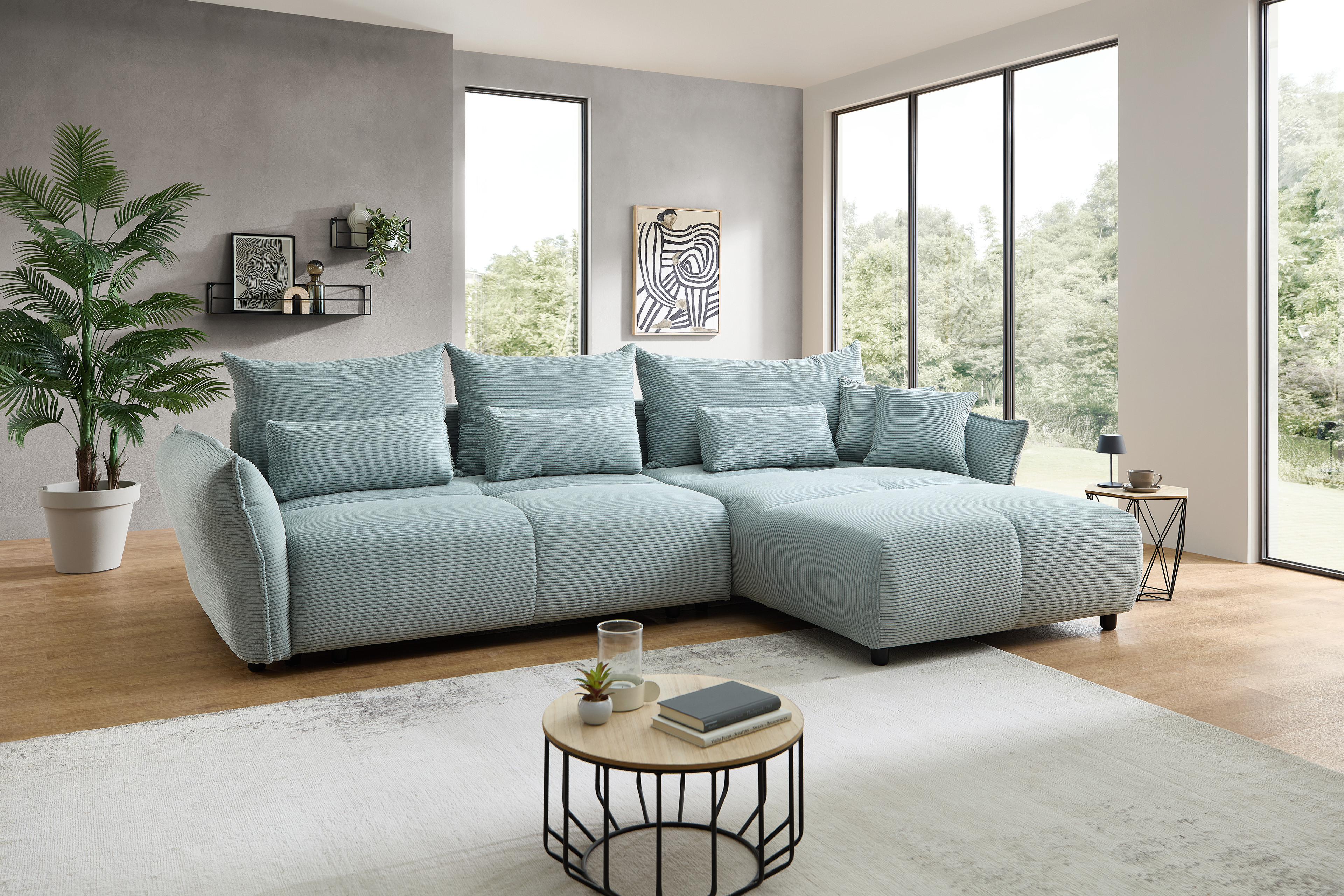 Sie sind auf der Suche nach einer charmanten Ruheoase für Ihr Zuhause? Nach einem anstrengenden Tag möchten Sie nach Hause kommen, die Beine hochlegen und einfach nur entspannen oder ein gutes Buch lesen? Zugleich sollte Ihr neues Sofa aber auch ausreichend Platz für Ihre Liebsten oder den Übernachtungsbesuch bieten? Dann sind Sie hier genau richtig - denn das Modell Amaro aus dem Hause Benformato wird allen diesen Anforderungen gerecht! Im angesagten Cordbezug im Farbton Hellblau wird die Eckgarnitur ganz sicher zum Eyecatcher in Ihrem Wohnzimmer. Ein erstklassiger Sitz- sowie Liegekomfort wird durch einen hochwertigen Federkern garantiert und eine überragende Sitztiefe von ca. 77 cm sowie die zahlreichen bereits im Lieferumfang enthaltenen Kissen sorgen für den höchsten Gemütlichkeitsfaktor. Aber das Benformato Sofa bringt nicht nur gutes Aussehen und Bequemlichkeit mit - in dieser formschönen Eckcouch steckt noch viel mehr! Eine integrierte Schlaffunktion mit einer Liegefläche von etwa 260 x 140 cm verspricht Ihren Schlafgästen angenehme Nächte und im ebenfalls integrierten Bettkasten finden nicht benötigte Kissen sowie Decken einen passenden Platz. Wählen Sie Ihren Wunschbezug, passen Sie Ihr neues Ecksofa farblich an Ihr Interieur an und bestellen Sie noch heute - Amaro von Benformato Polstermöbel.