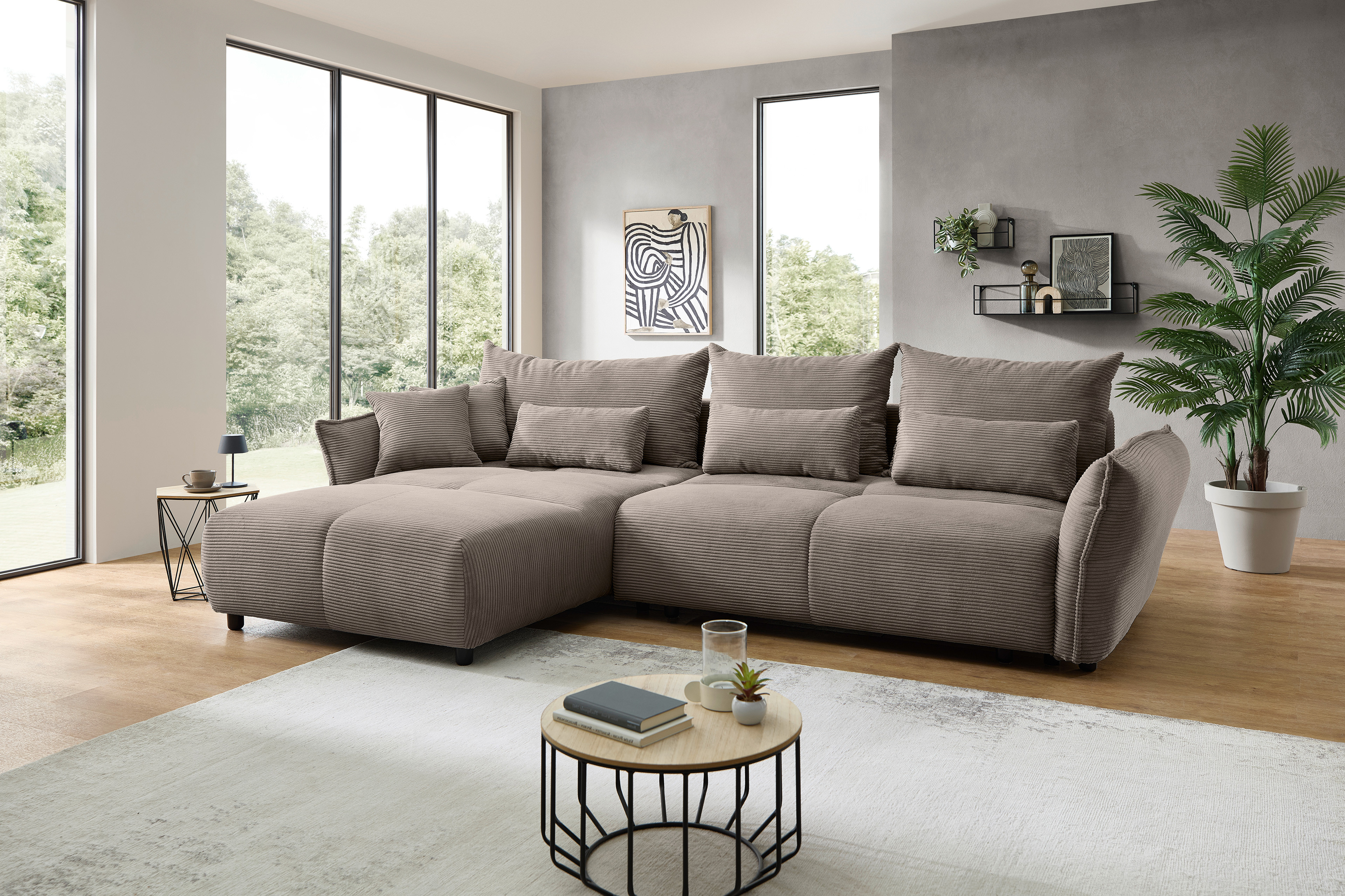 Sie sind auf der Suche nach einer charmanten Ruheoase für Ihr Zuhause? Nach einem anstrengenden Tag möchten Sie nach Hause kommen, die Beine hochlegen und einfach nur entspannen oder ein gutes Buch lesen? Zugleich sollte Ihr neues Sofa aber auch ausreichend Platz für Ihre Liebsten oder den Übernachtungsbesuch bieten? Dann sind Sie hier genau richtig - denn das Modell Amaro aus dem Hause Benformato wird allen diesen Anforderungen gerecht! Im angesagten Cordbezug im Farbton Grau-Braun wird die Eckgarnitur ganz sicher zum Eyecatcher in Ihrem Wohnzimmer. Ein erstklassiger Sitz- sowie Liegekomfort wird durch einen hochwertigen Federkern garantiert und eine überragende Sitztiefe von ca. 77 cm sowie die zahlreichen bereits im Lieferumfang enthaltenen Kissen sorgen für den höchsten Gemütlichkeitsfaktor. Aber das Benformato Sofa bringt nicht nur gutes Aussehen und Bequemlichkeit mit - in dieser formschönen Eckcouch steckt noch viel mehr! Eine integrierte Schlaffunktion mit einer Liegefläche von etwa 260 x 140 cm verspricht Ihren Schlafgästen angenehme Nächte und im ebenfalls integrierten Bettkasten finden nicht benötigte Kissen sowie Decken einen passenden Platz. Wählen Sie Ihren Wunschbezug, passen Sie Ihr neues Ecksofa farblich an Ihr Interieur an und bestellen Sie noch heute - Amaro von Benformato Polstermöbel.