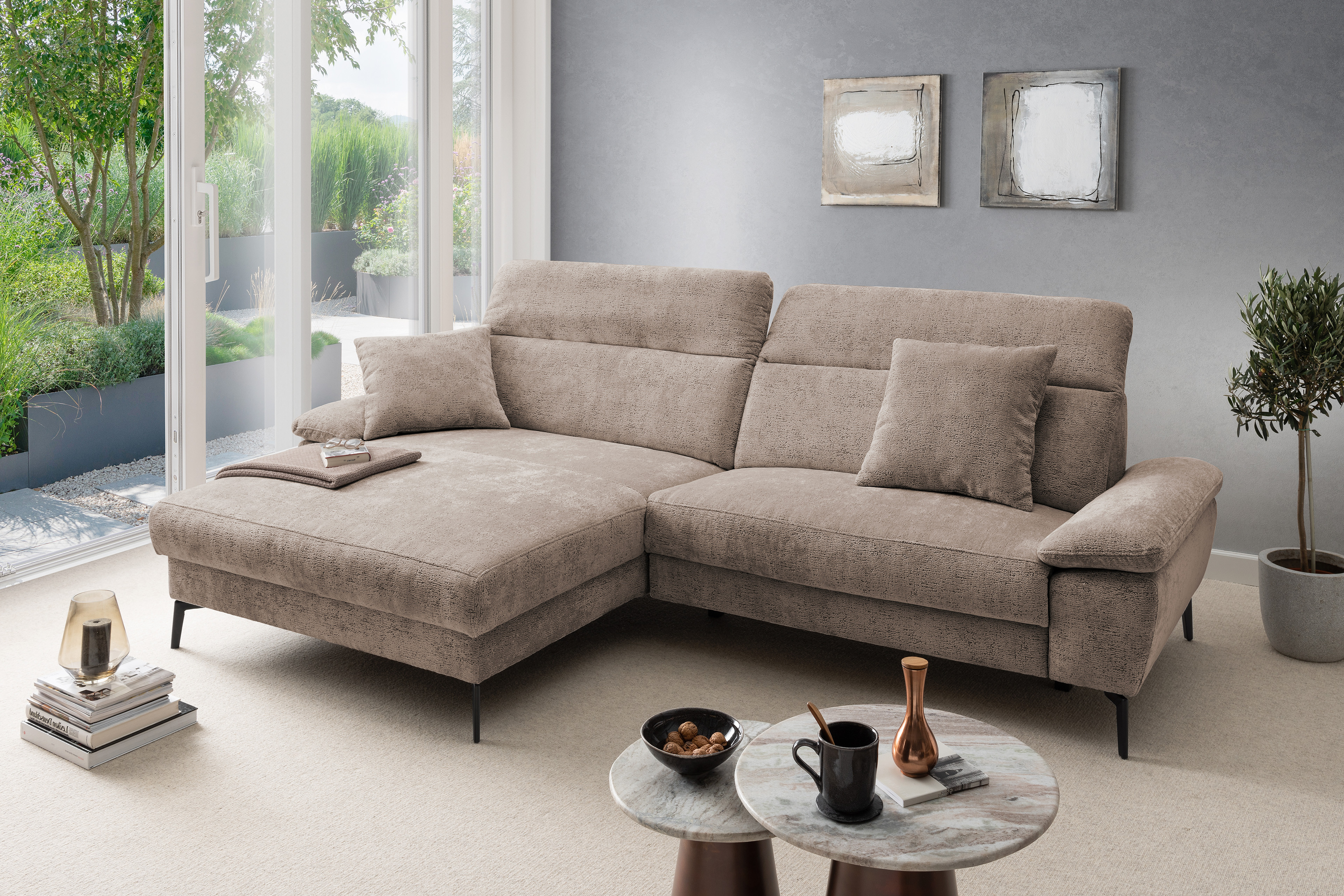 Stellen Sie sich vor, Sie kommen nach einem langen Tag nach Hause, Sie lassen sich fallen und der Stress des Alltags bleibt einfach draußen. Die moderne Eckgarnitur Cancelli von Benformato ist nicht einfach nur ein Möbelstück, sie ist Ihre persönliche Wohlfühloase. Ganz gleich, ob ein geselliger Wein-Abend mit Ihren liebsten Freunden ansteht oder Sie den perfekten Serien-Marathon planen: Auf der großzügigen Zusammenstellung aus einer Recamiere mit anschließendem 2-Sitzer findet das Leben statt. Die hochwertige Federkern-Polsterung fängt Sie sanft auf und bietet einen Sitzkomfort, der Sie den Alltag vergessen lässt. Passen Sie die Kopfteile mit einem einfachen Handgriff genau an Ihre Bedürfnisse an und spüren Sie, wie sich die Anspannung löst. Sie möchten den absoluten Luxus? Gönnen Sie sich das Upgrade auf die elektrische Relaxfunktion im 2-Sitzer. Ein Knopfdruck genügt, und Sie gleiten sanft in die wohltuende Herz-Waage-Position. Ihre Beine ruhen auf einer Höhe mit Ihrem Herzen - ein Gefühl von Schwerelosigkeit, das Ihren Kreislauf spürbar entlastet. Eingehüllt in ein kuschelweiches Chenille-Flachgewebe, verleiht die Garnitur Ihrem Wohnzimmer eine unwiderstehlich behagliche Atmosphäre. Und weil Ihr Zuhause so individuell ist wie Sie: Wählen Sie aus einer riesigen Farb- und Stoffkollektion genau das Design, das Ihr Herz höherschlagen lässt. Schaffen Sie sich den Rückzugsort, den Sie verdienen. Holen Sie sich die Cancelli von Benformato nach Hause.