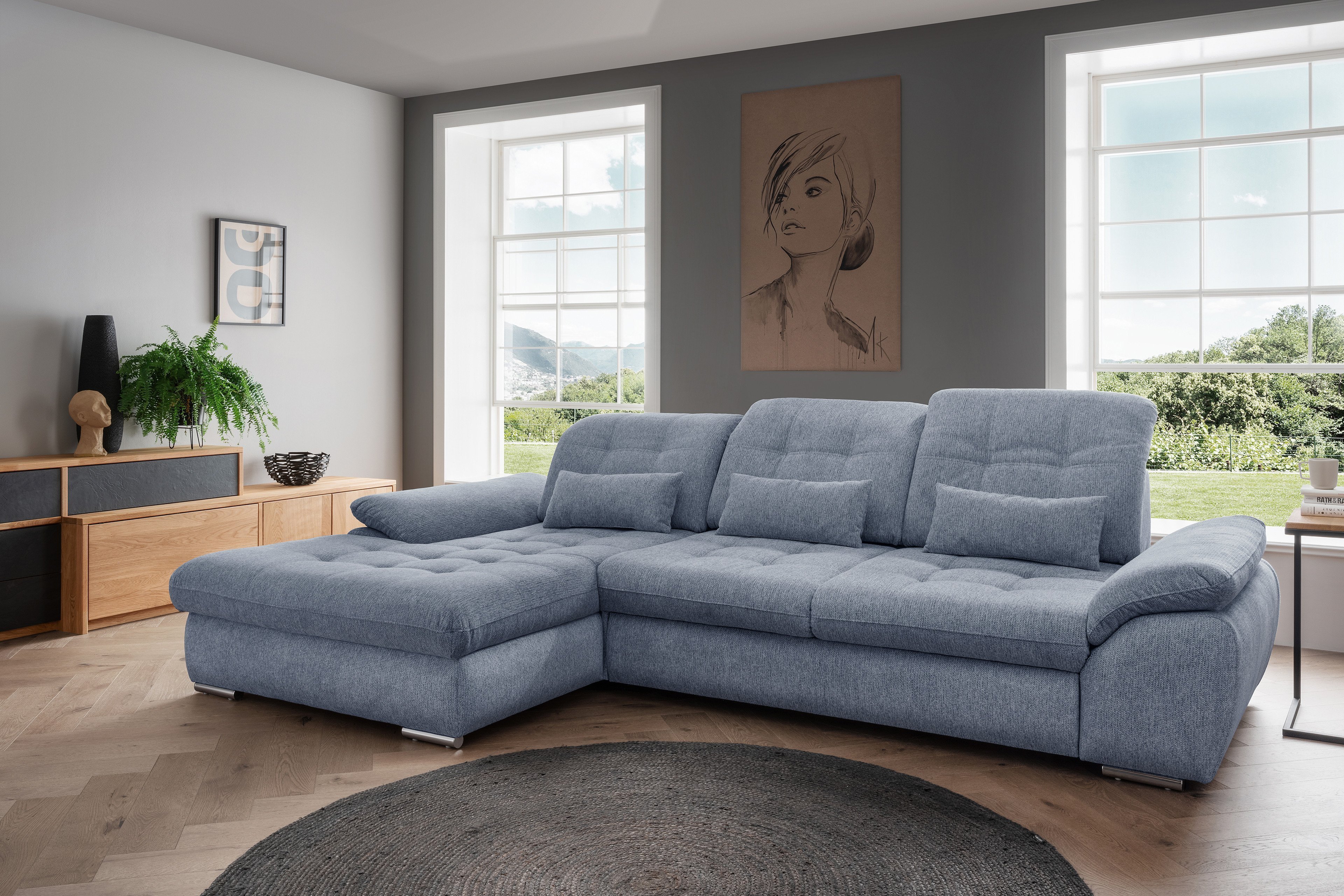 Das es hier gemütlich zugeht, sieht man schon auf den ersten Blick - das Modell Rigatti-LE24 von Benformato zeigt sich mit einem dezenten Chenille-Flachgewebe in Blau von seiner schönsten Seite. Der zeitlose Farbton passt perfekt zu den meisten Wohnstilen, die er harmonisch abrundet und Ihnen eine behagliche Note verleiht. Mit einem Stellmaß von ca. 184 x 318 cm findet die Eckgarnitur stets den richtigen Platz, sodass Sie schnell Ihren Lieblingsplatz auf dem Sofa finden, um den Abend entspannt ausklingen zu lassen. Doch nicht nur durch sein zeitloses Aussehen besticht das Sofa, sondern auch durch praktische Komfortfunktionen. So befindet sich im 2-Sitzer der Garnitur eine Sitztiefenverstellung - hier können Sie die Sitztiefe an Ihre Position anpassen. Eine integrierte Kopfteilverstellung bietet Ihnen zusätzlich eine Stütze für Ihren müden Nacken, um Ihnen ein gesundes Sitzen zu ermöglichen. Wenn Sie lange Winterabende mit einem heimeligen Feuer im Kamin, eingekuschelt auf dem Sofa verbringen oder Gästen einen passenden Schlafplatz zur Verfügung stellen möchten, können Sie dank der integrierten Schlaffunktion einen großzügigen Schlafbereich mit einer Liegefläche von etwa 228 x 137 cm schaffen. Der inkludierte Bettkasten bietet Ihnen Platz für gerade nicht benötigte Kissen sowie Decken. Genießen Sie das ultimative Komplettpaket aus bestechendem Design und komfortabler Ausstattung - mit Rigatti-LE24 von Benformato.